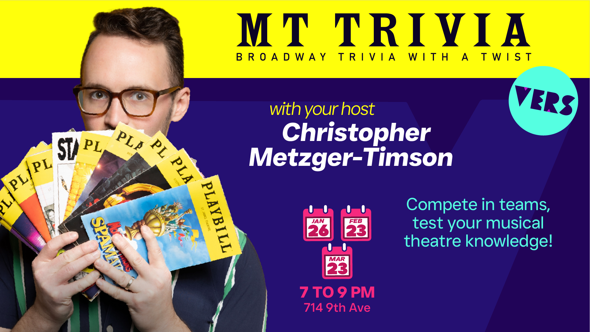 Join Chris Metzger-Timson and guest Broadway stars for Musical Theatre Triviaโฆ Broadway Trivia with a Twist! Compete in teams, test your musical theatre knowledge, and win prizes.